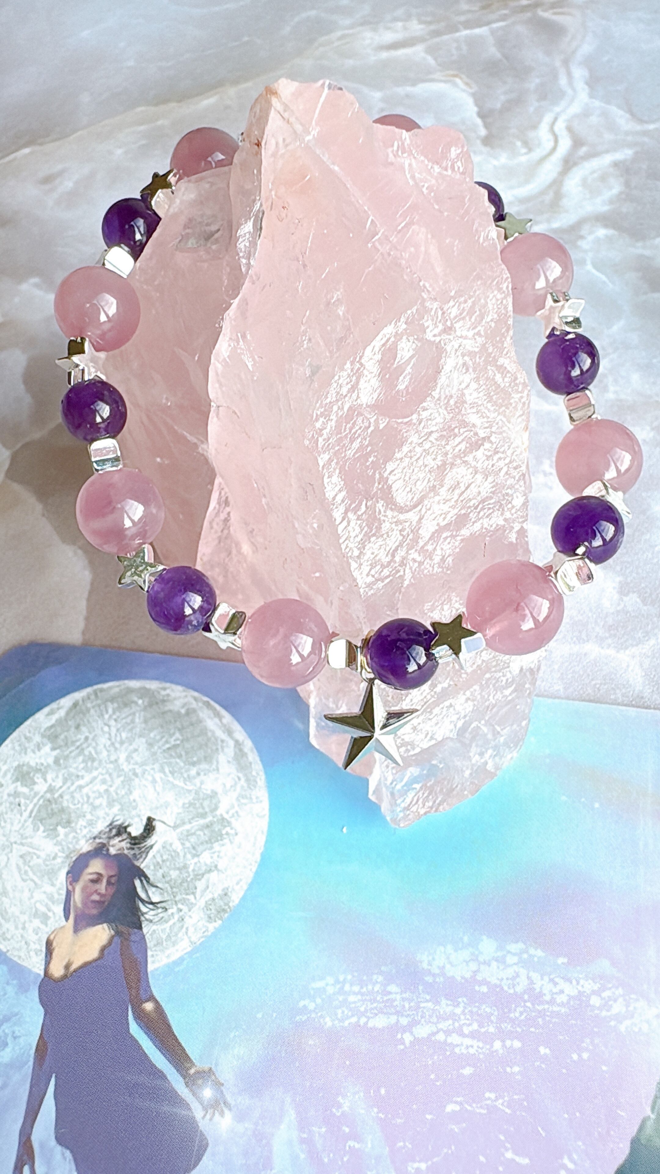 希少な愛の石・パープルスターローズクォーツと水瓶座の守護石のアメジストの神秘性に、シルバーの星ビーズをぐるっと纏いキュートかつクールさをプラスしました。